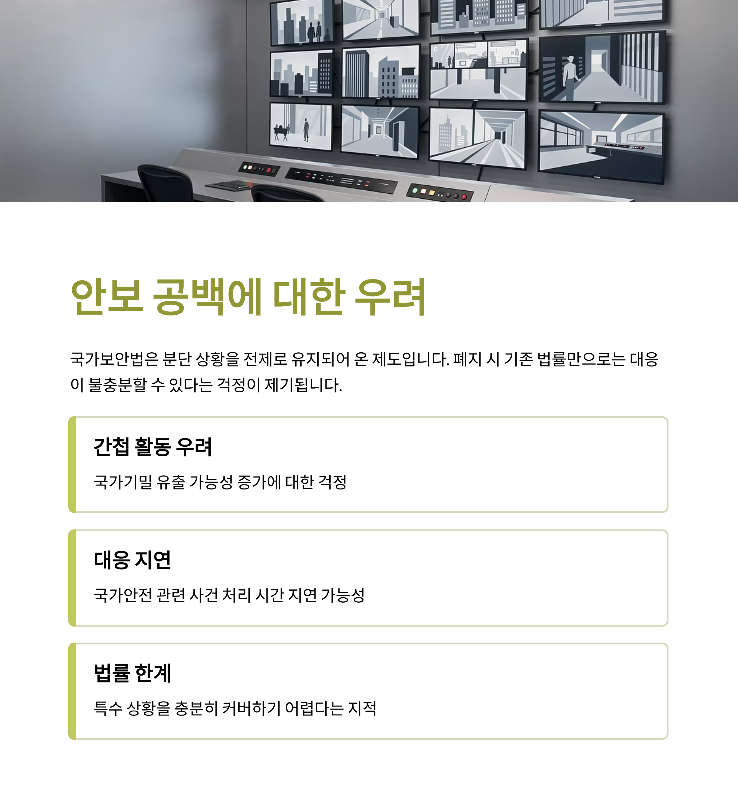 가장 두드러지는 이유는 국가안전의 공백에 대한 걱정입니다. 국가보안법은 북한과의 특수한 분단 상황을 전제로 유지되어 온 제도이며, 폐지가 이루어질 경우 기존 법률만으로는 대응이 불충분해질 수 있다는 우려가 꾸준히 제기됩니다. 전문가들도 분단 상황이라는 특수성을 고려해야 한다는 점을 여러 차례 언급해왔습니다.
