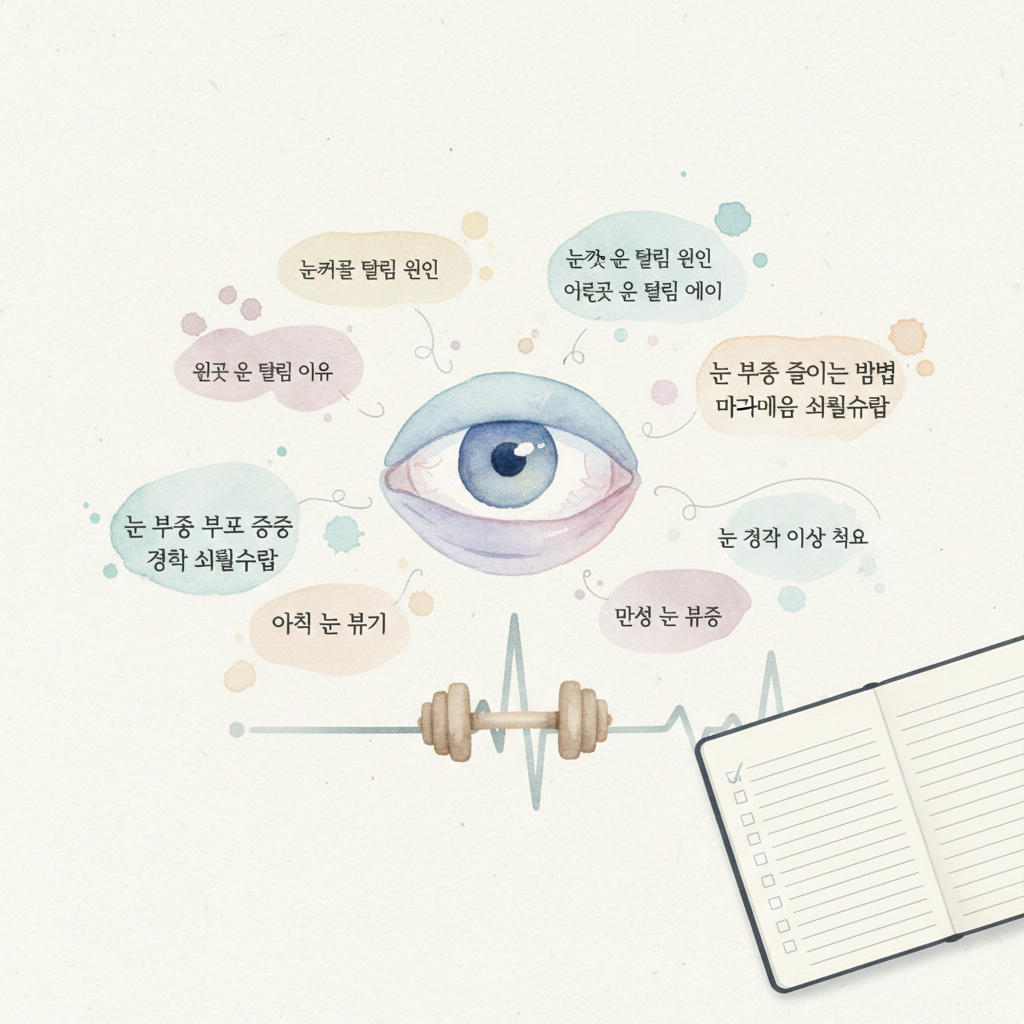 안검염(눈꺼풀 염증), 다래끼, 결막염 등 눈 자체의 염증이나 감염도 국소적인 눈 붓기를 유발합니다. 통증, 가려움, 충혈, 이물감 등이 동반될 수 있습니다. 특히 눈꺼풀 떨림 원인과 관련하여 마그네슘 부족 증상을 의심하는 경우가 많으나, 떨림과 붓기는 다른 원인일 수 있습니다.