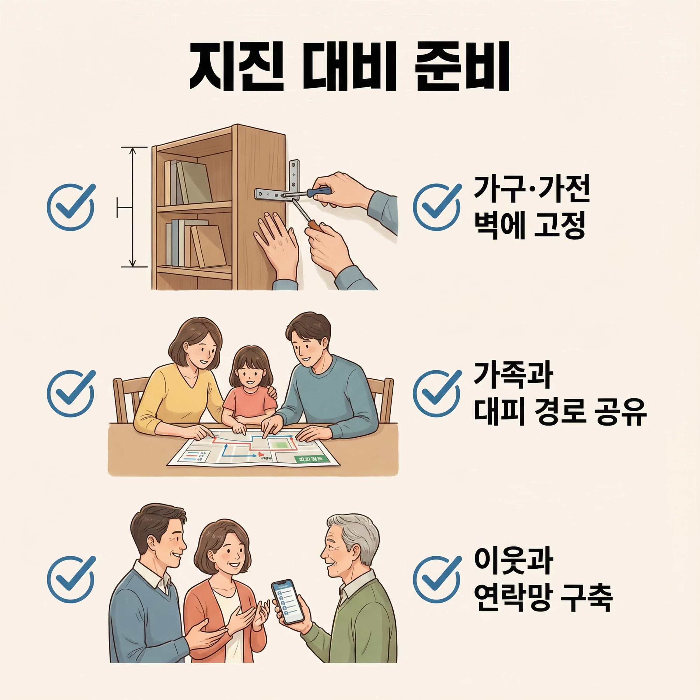 이 단계에서 가장 중요한 기준은 ‘사전 고정과 공유’ 입니다. 혼자만 준비하는 것보다 가족과 이웃이 함께 준비할수록 효과가 커집니다.