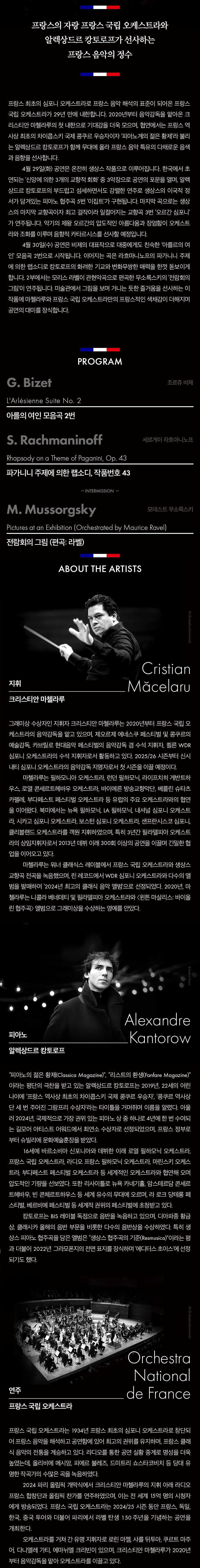 지휘자는 유럽에서 극찬받는 크리스티안 마첼라루. 협연 피아니스트는 세계 최고 권위의 차이콥스키 콩쿠르에서 우승한 알렉상드르 캉토로프. 이 무대가 특별한 이유는 충분합니다.