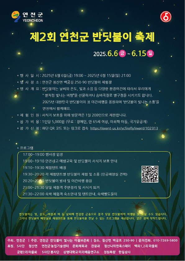 이벤터스 홈페이지(https://event-us.kr/ycfirefly/event/102313)에서 신청하거나 QR코드를 통해 접속 가능합니다.